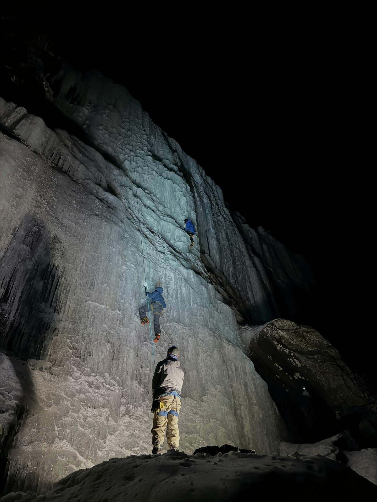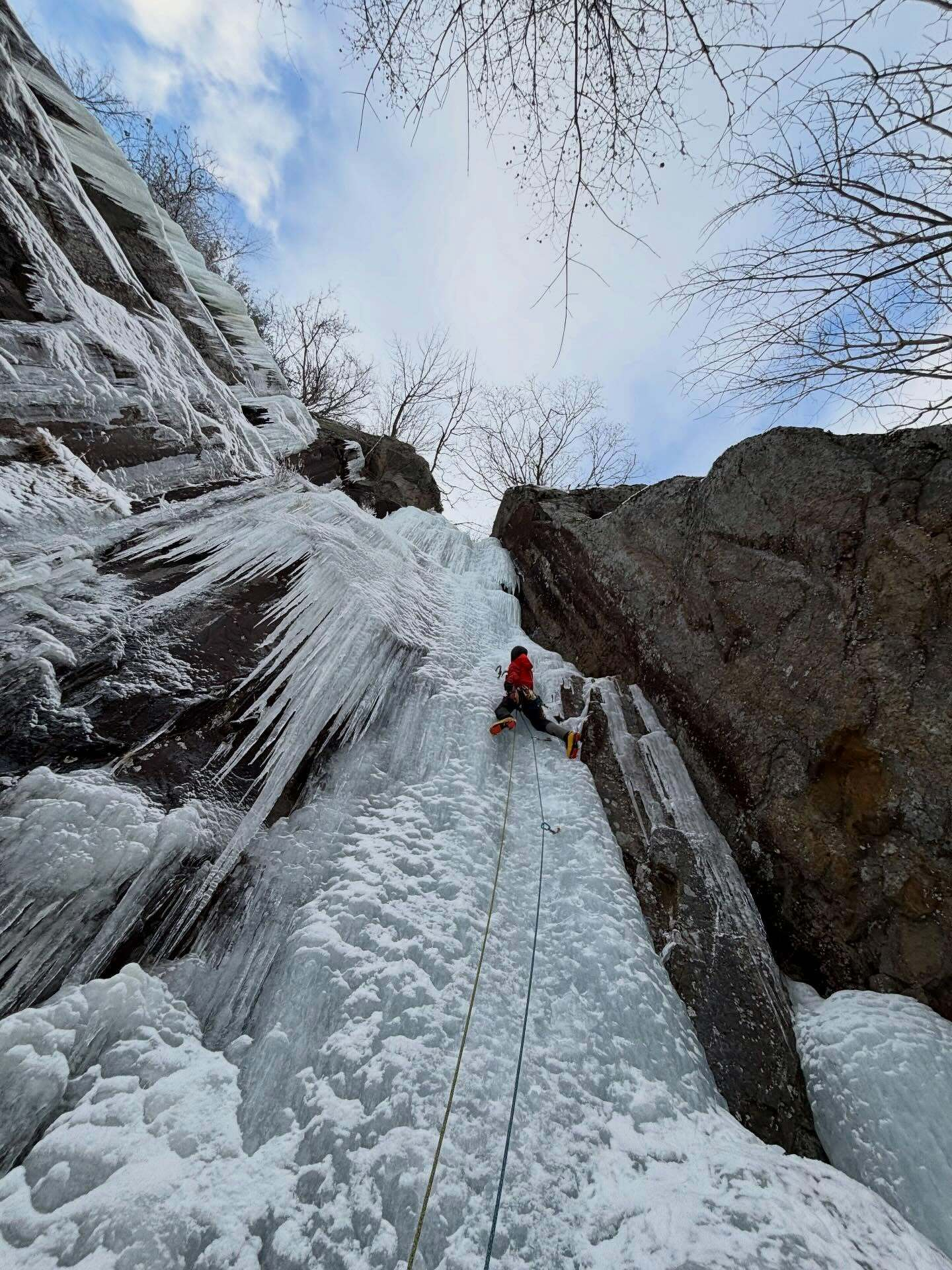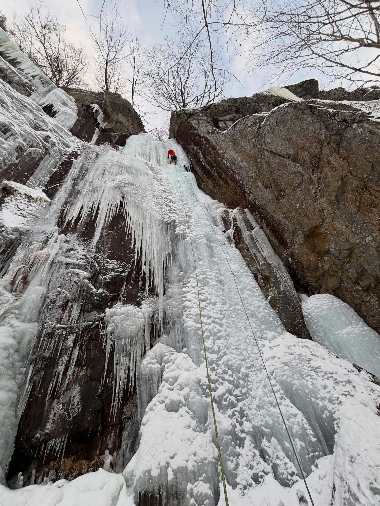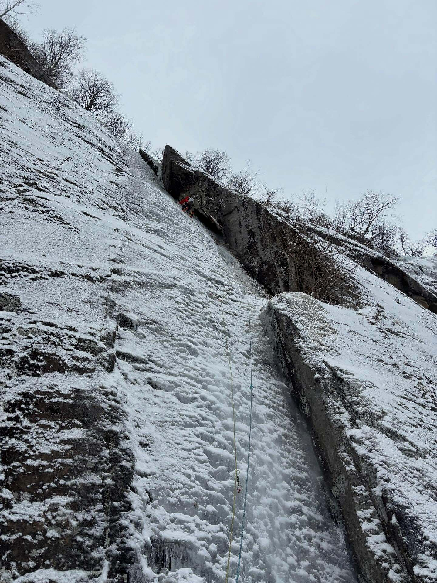 Another stellar day climbing frozen water with clients and friends. This time in the sun for the first day this season! ☀️ Pitchoff Left was chandeliered but pretty good, getting mushy by midafternoon. Hot Shot and Ice Slot in the Canyon were wet and wonderful. Today marked 50 pitches this season for me. 🙌