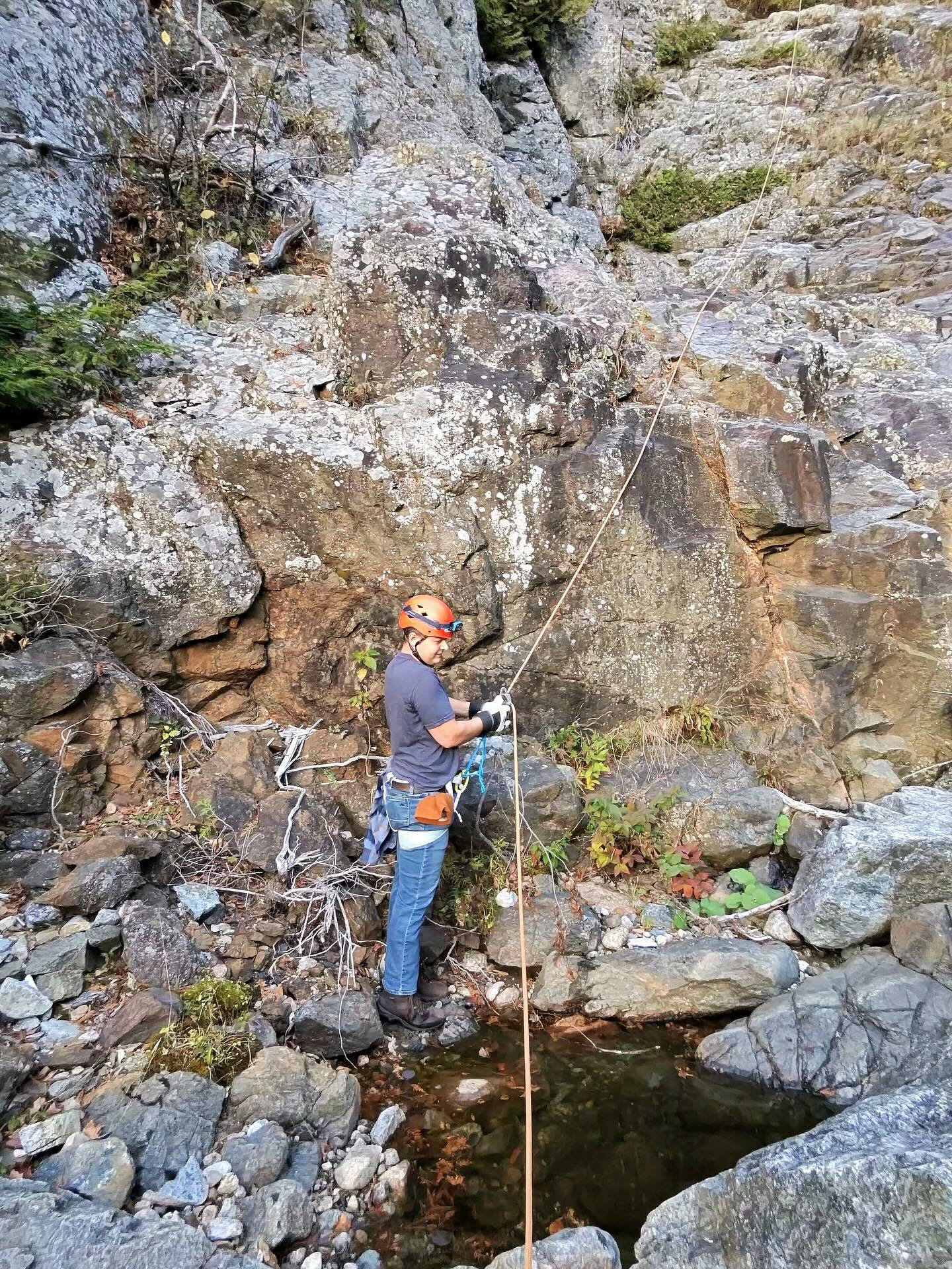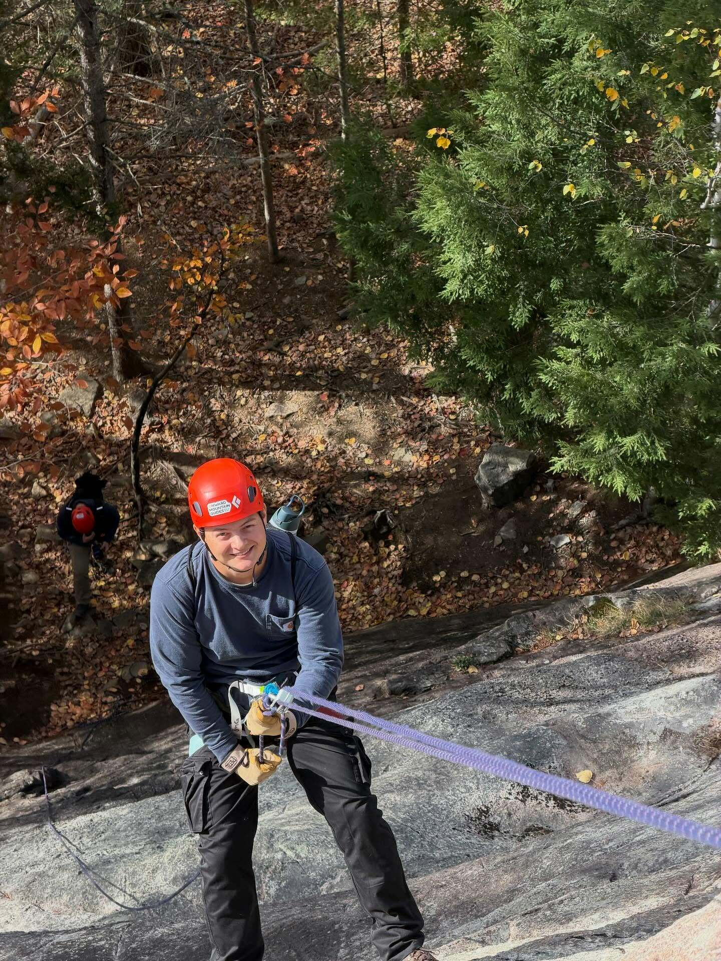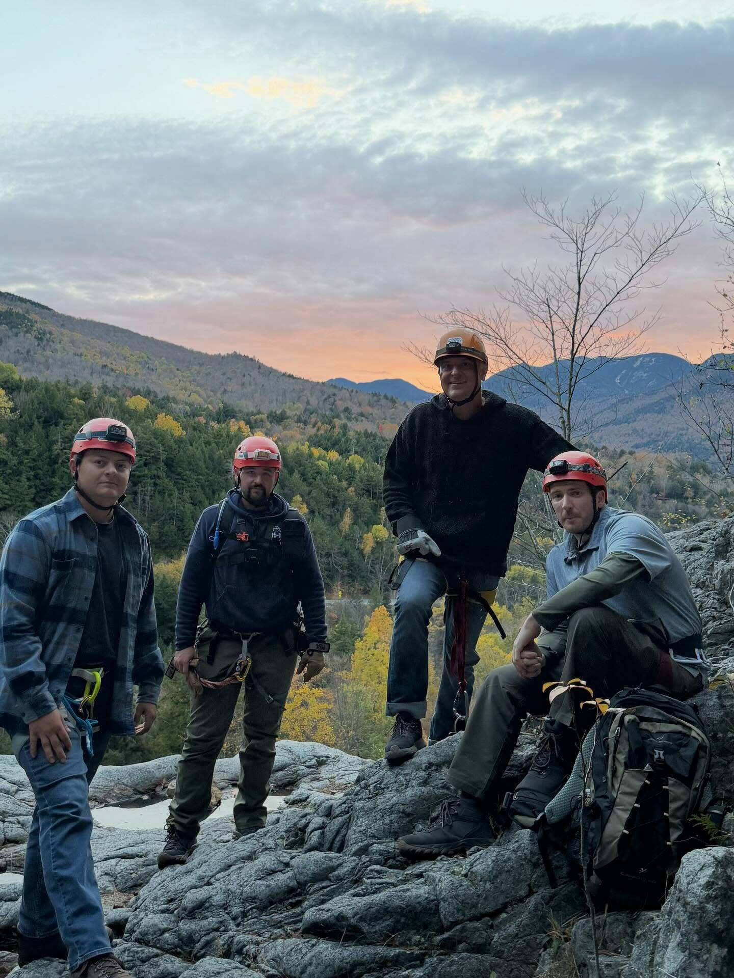The boys are back in town! Brandon, Kevin, Shane, and Brian all came upstate for a weekend of camaraderie and adventure — and they sure got it! We spent yesterday rock climbing and doing a rappelling clinic at King Philip Spring Wall, and then this evening the main event: a stunning sunset rappel down Roaring Brook Falls. It was so great to hang out with these guys and swap stories. Their firefighter training gave them all a great base for learning technical systems, so moving into the rock world was a logical step. Can’t wait to have them back!
