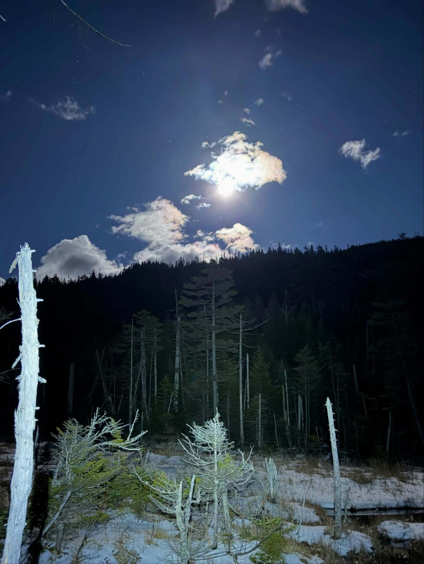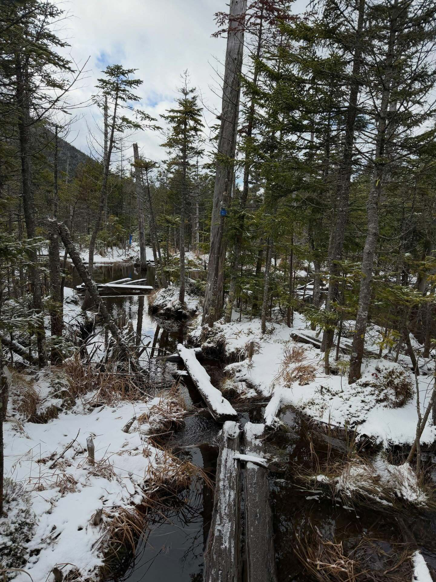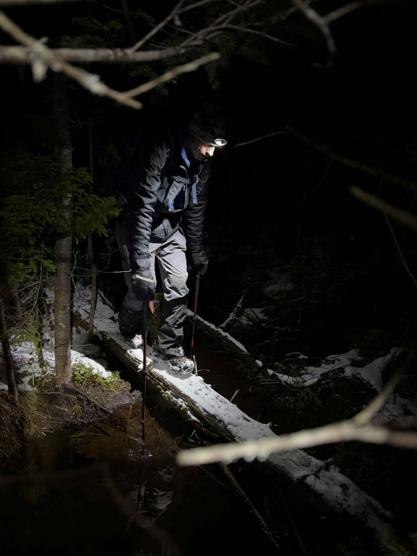 Cliff & Redfield packed a punch for Tom’s 43rd and 44th high peaks. More snow AND more water made conditions quite challenging in both the low and high elevations. Getting to the Uphill Lean-to from the Loj via Lake Arnold and the floating logs took about 5.5 hours, then up and down Redfield (nice views, and snow 6-inches deep!) in about 3.5 hours, and Cliff (the cliffs weren’t too icy yet) in about 2.5 hours. About 6 hours for the return hike in headlamps (incredible full moon!) put us at around 17.5 hours of constant movement — our longest yet. We head into the mountains to test ourselves, and Tom continues to impress!