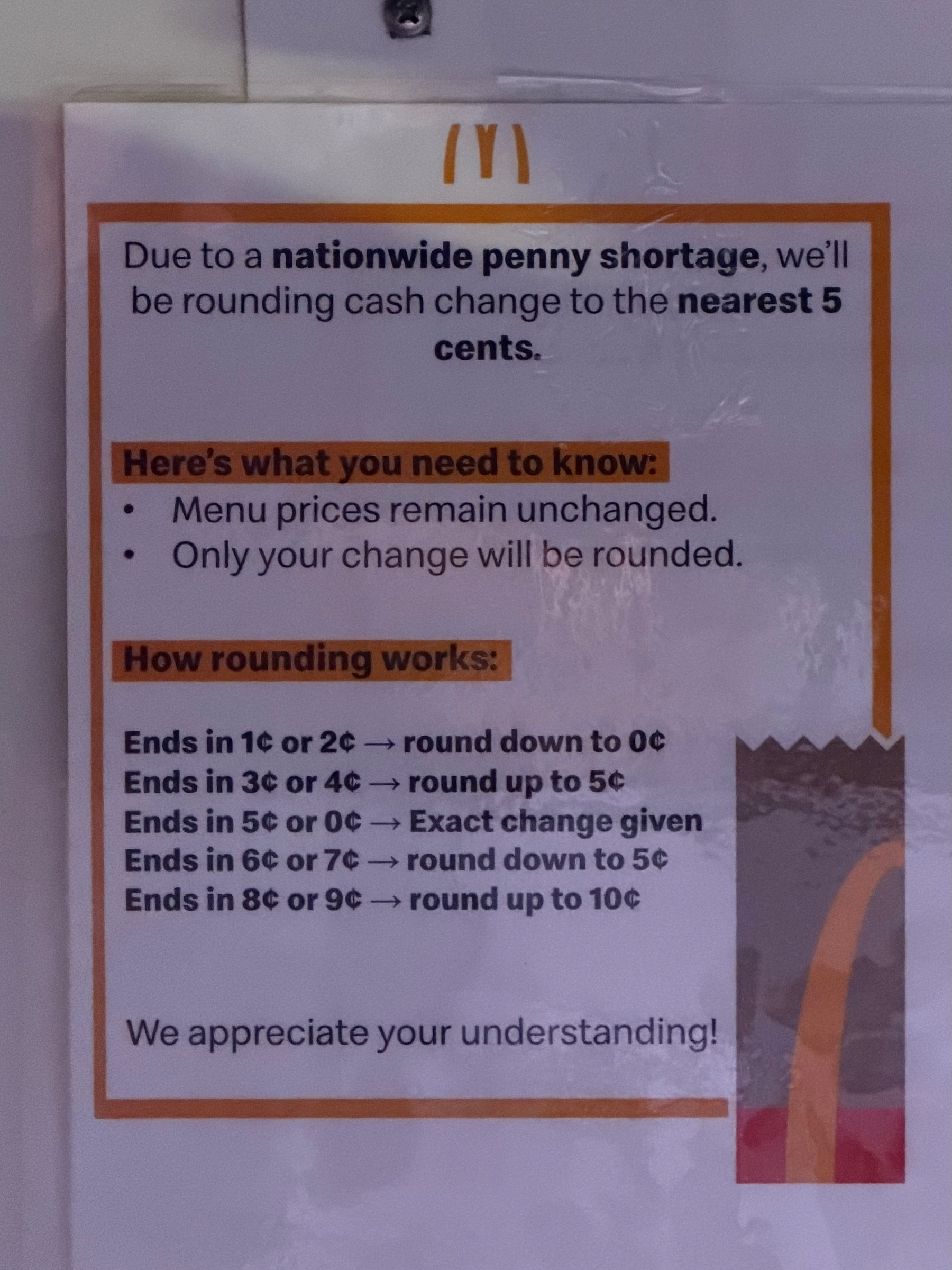 McDonald’s isn’t wasting any time in phasing out the penny here in the U.S. I actually snapped this photo at the drive-through a couple days ago, before we stopped minting pennies: