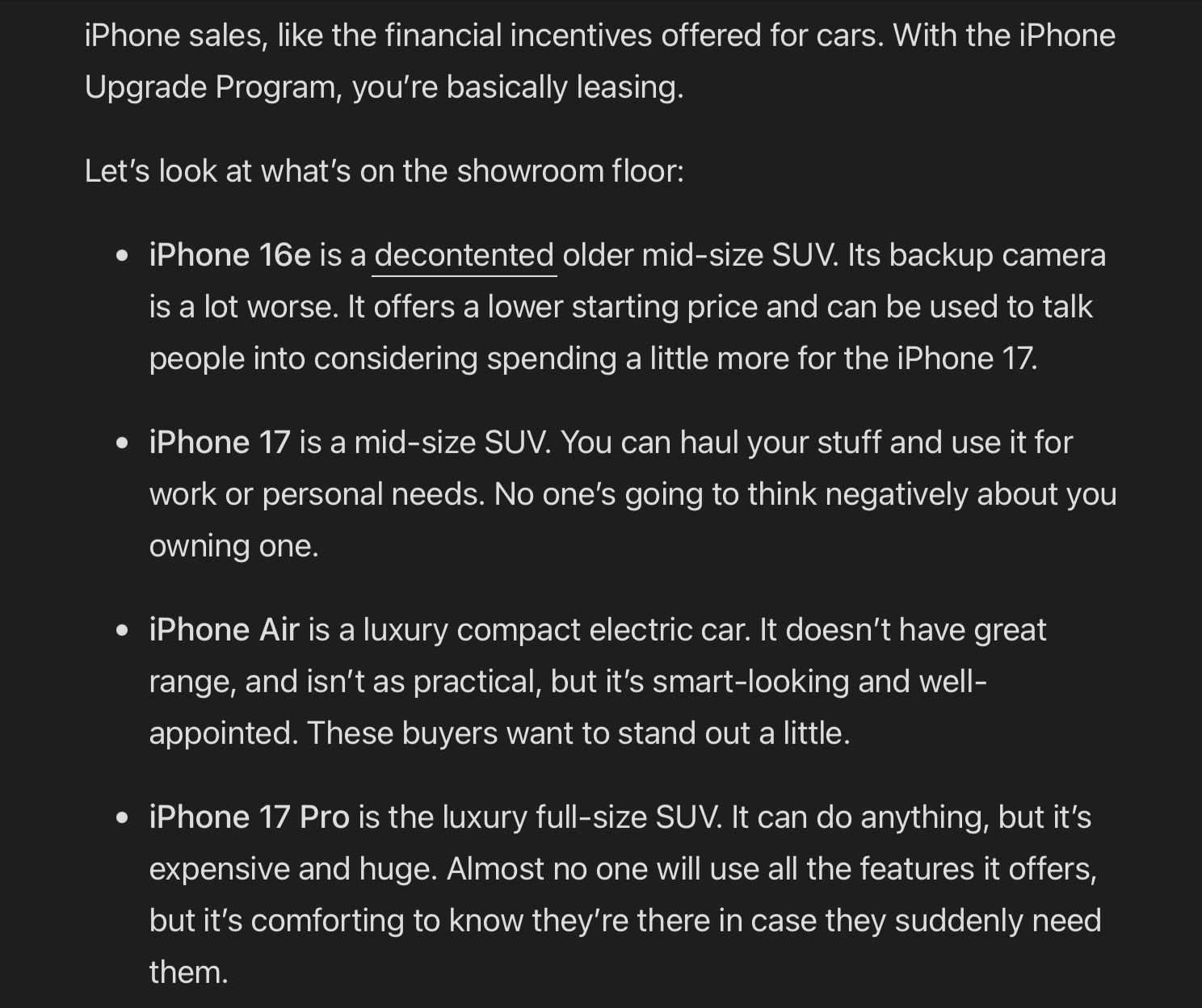 This comparison of iPhone models to car models by @joesteel@duck.haus is quite apt: