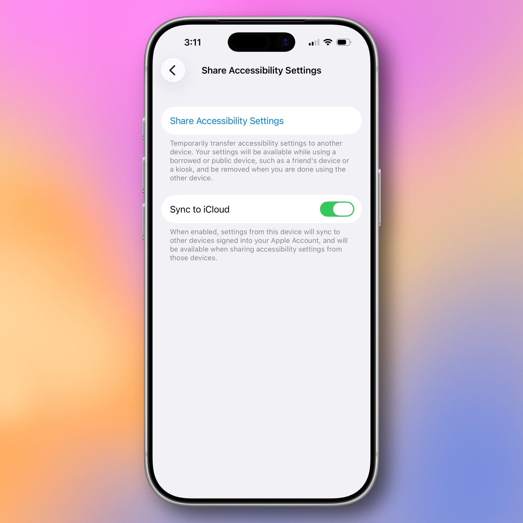 Dunno when this ‘Sync to iCloud’ option was added to the Accessibility settings in iOS, but it’s a fantastic addition. Trying to keep these settings in sync across devices has been a real pain.