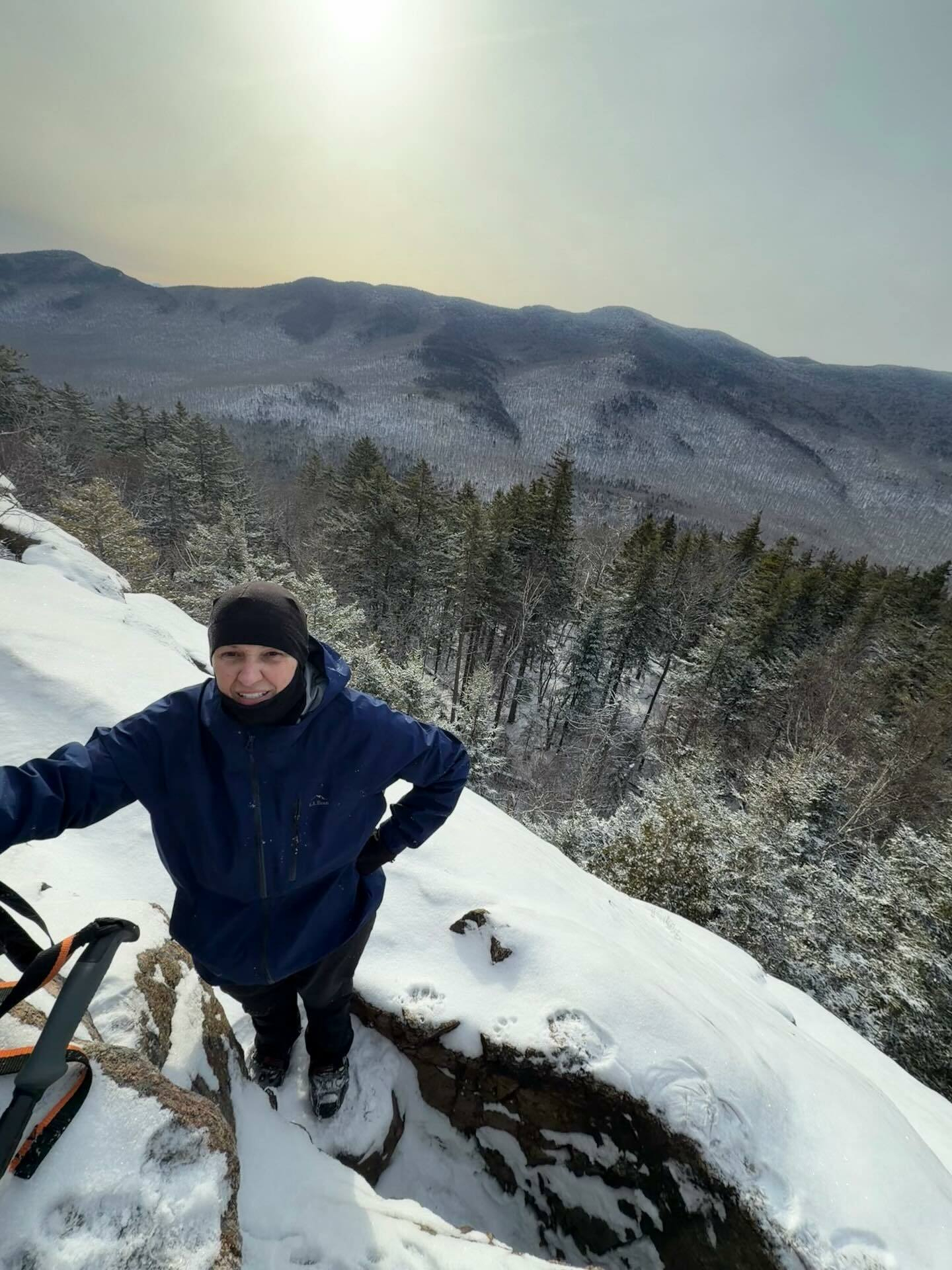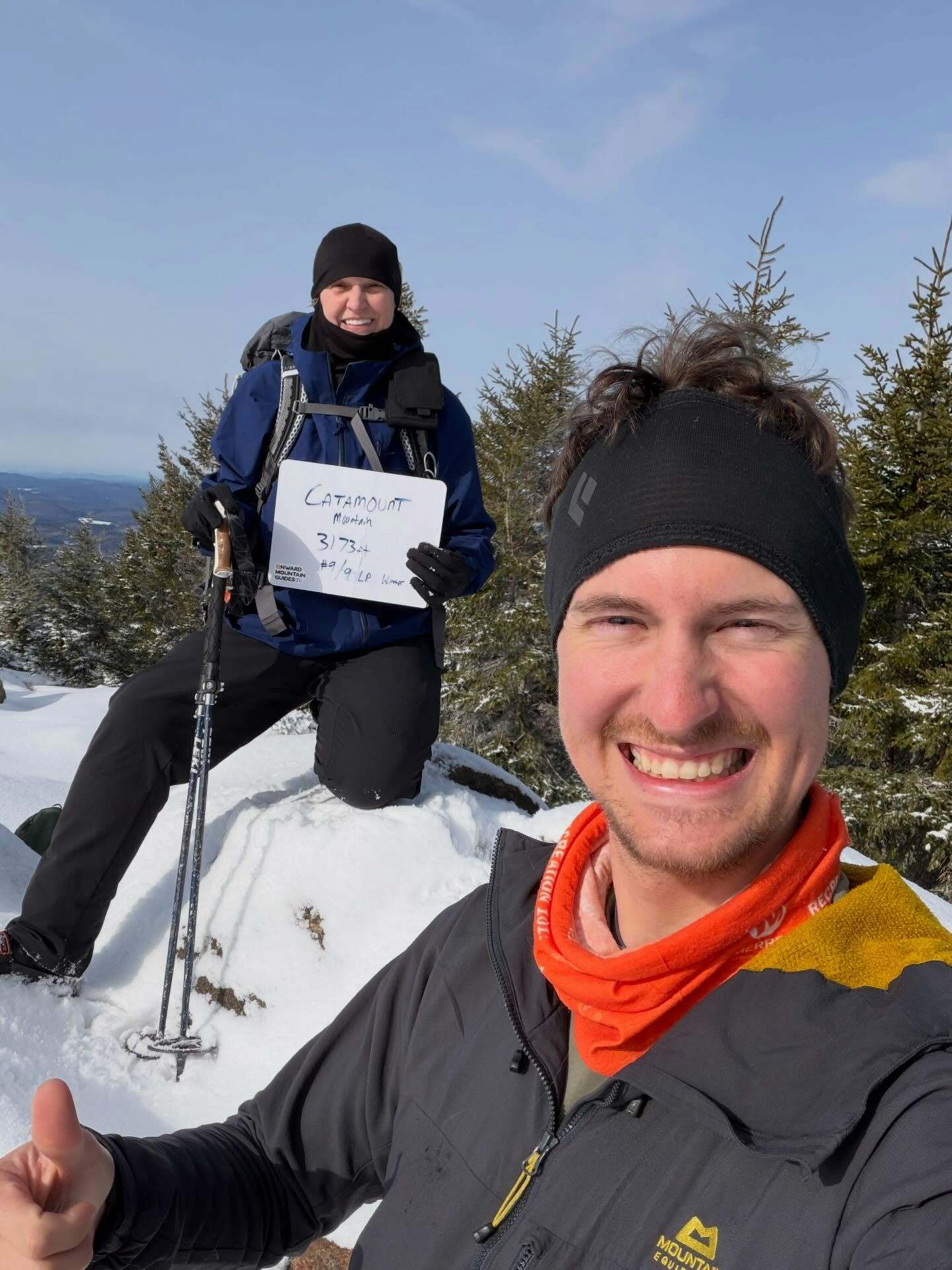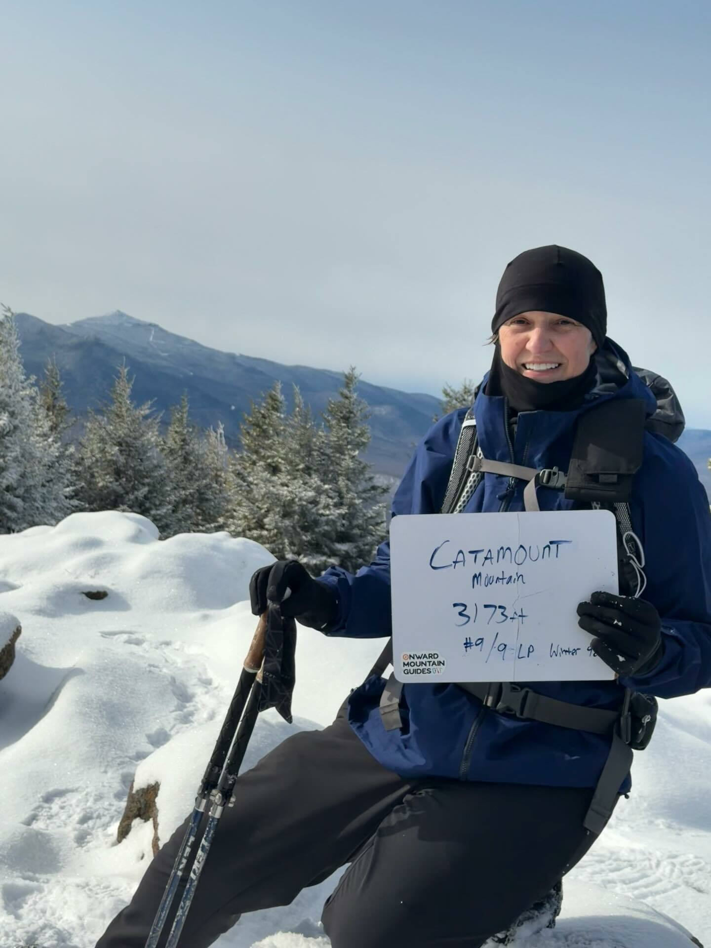 She did it! Three years in the making and after thwarted winter attempts, Karen summited Catamount Mountain to complete her winter round of the @lakeplacid9er challenge! 🥳 🏔️ Fresh snow helped a ton to cover the glare ice underneath, but our spikes were definitely needed from bottom to top. We lucked out with great views, sun, and no wind! The clouds held off until we were descending. Well done, Karen, your joyful outlook made the day great!
