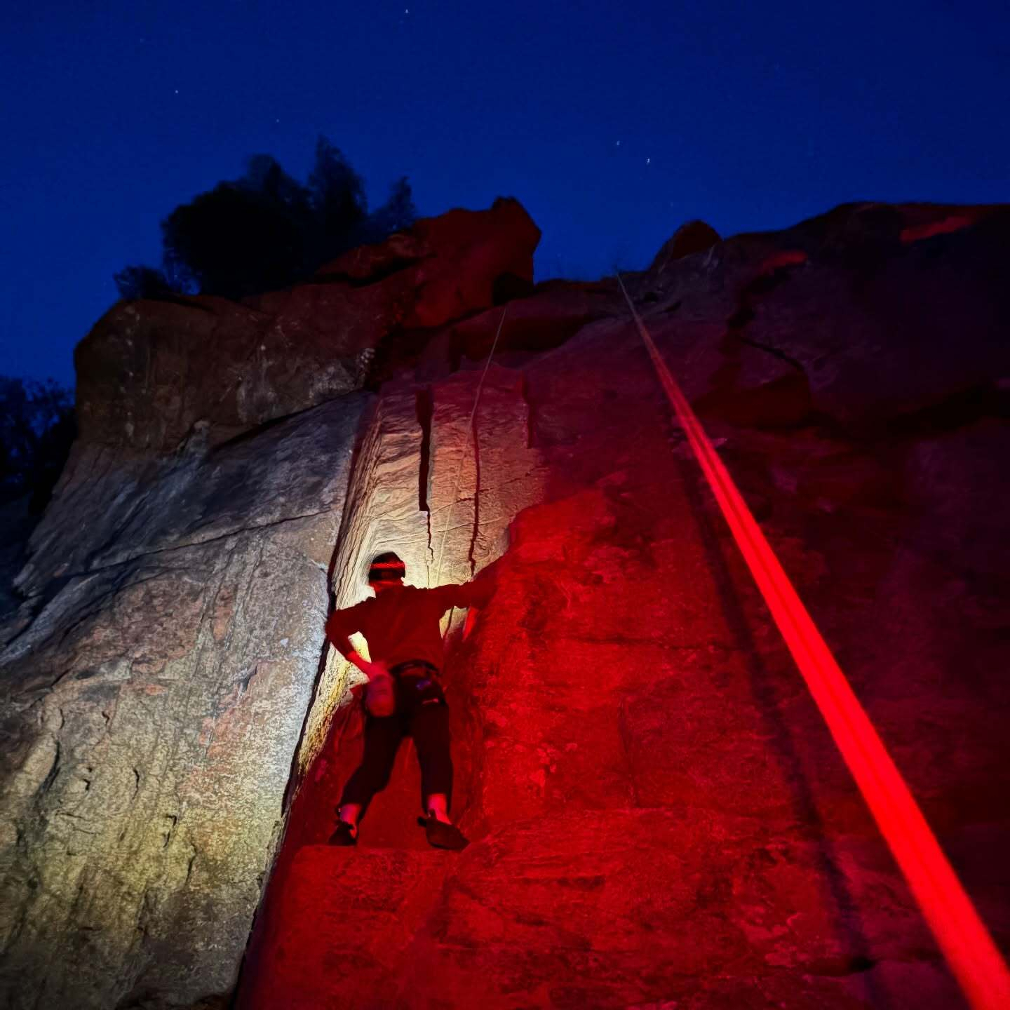 Climber ascending a large rocky cliff in a forested area with another person below managing ropes amidst scattered trees and sunlight casting shadows on the rock face. Climber ascends vertical rock face using handholds and footholds wearing a helmet and winter jacket surrounded by a rocky forested hillside with sparse trees and a rope providing safety. Climber ascends a large rocky cliff using a pink rope surrounded by sparse trees under a clear blue sky. A person wearing a pink helmet climbs a steep rock face using climbing gear amidst a forested landscape with tall trees and a clear blue sky in the background. A person wearing climbing gear ascends a rock face in a dimly lit outdoor area at night with a safety rope secured above and leafless branches nearby. Climber ascends a rock wall using ropes illuminated by red light during nighttime under a clear starry sky with shadows cast on the jagged rock surface. Person holding a red light stands by a rocky cliff face illuminated in red against a backdrop of bare trees at twilight