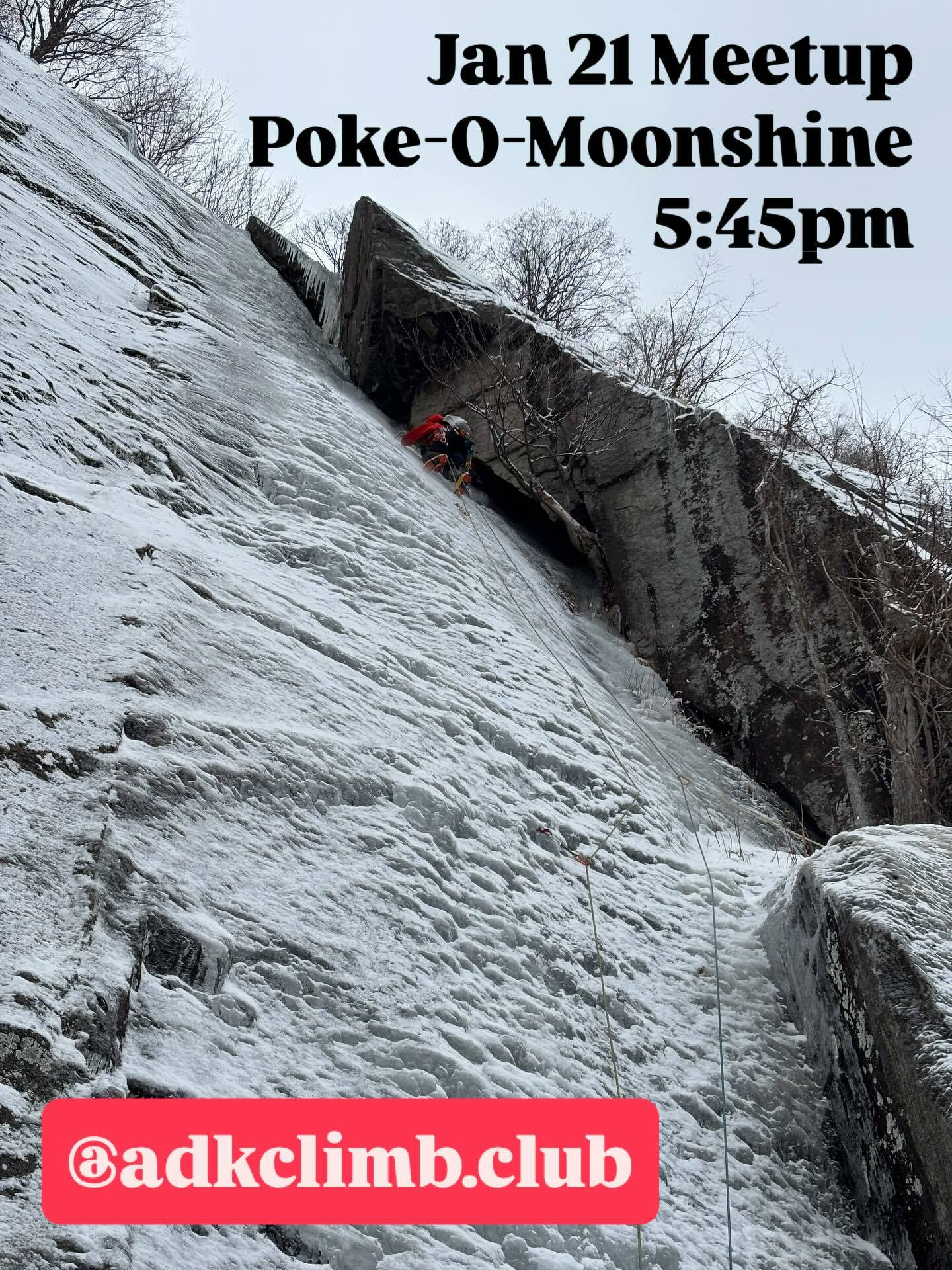 For our Jan 21 ice climber meetup, we’re heading east to Plattsburgh and the steep walls of Poke-O-Moonshine. We’ll meet in the old campground parking lot at 5:45pm and then walk up to the Waterfall and set up top ropes there! Driving directions and more info at the link in our bio. Don’t forget your headlamp, and consider setting up carpools via our WhatsApp community chat.