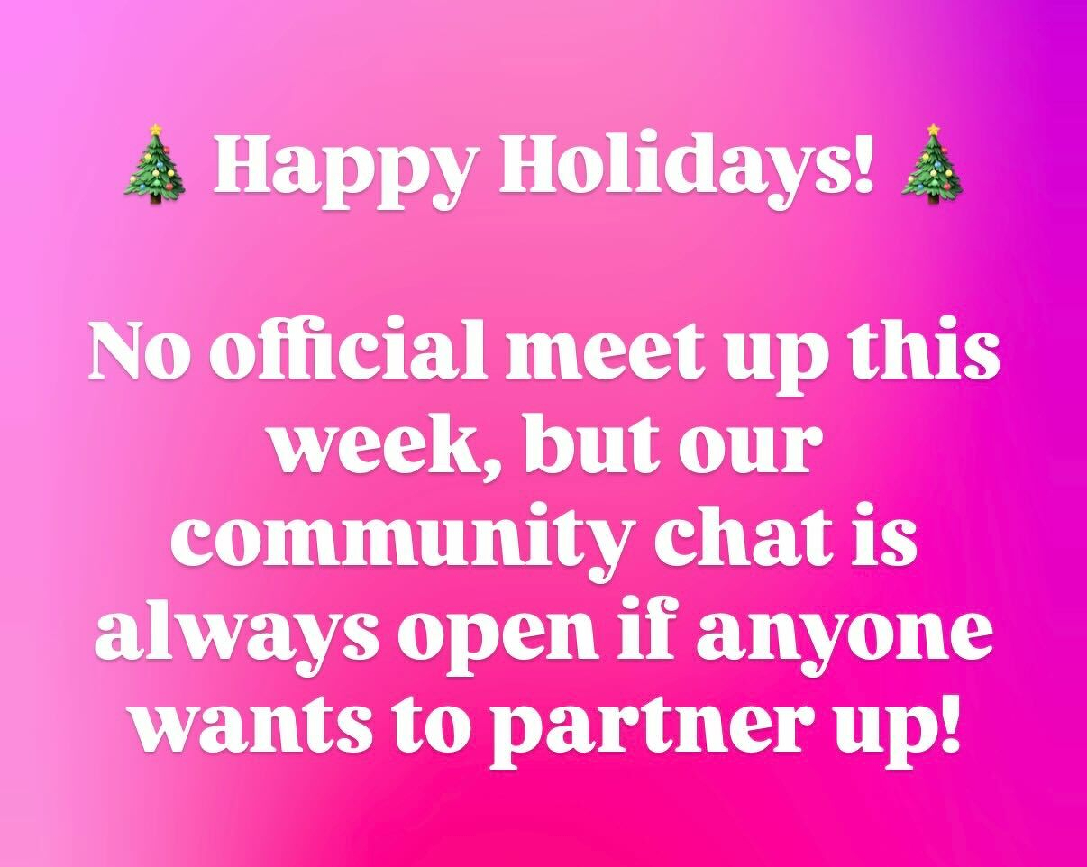 🎄 Happy Holidays! No official meet up this week (or next), but our community chat is always open if anyone wants to partner up! Link in bio. Take care, everyone!