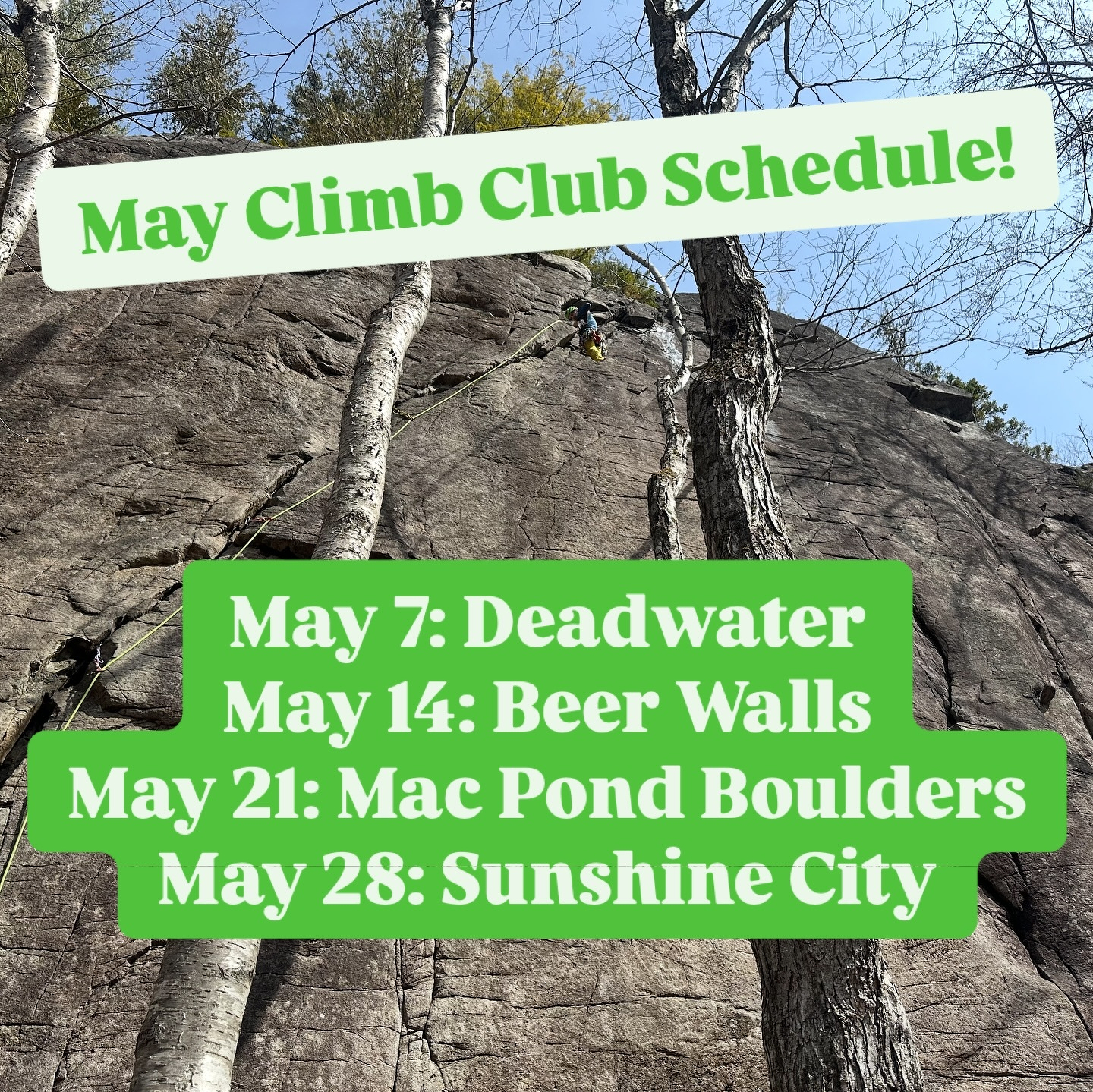May 7: Deadwater May 14: Beer Walls May 21: McKenzie Pond Boulders May 28: Sunshine City