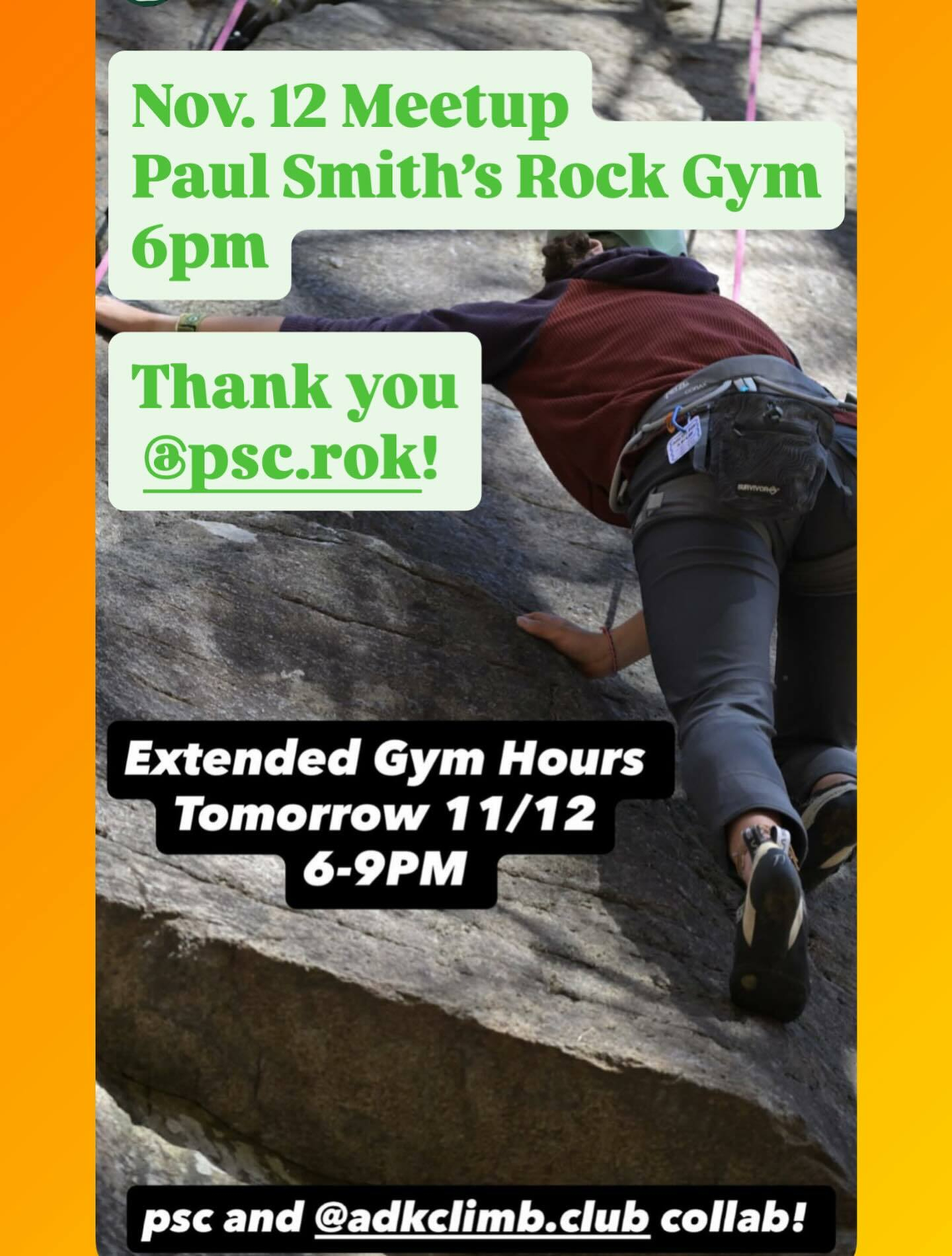 Outdoor rock season has pretty much come to a close here in the heart of the ADK, so until accessible ice comes in, we’ll be moving indoors. Our meetup on Wednesday, November 12 will be graciously hosted by the Paul Smith’s Rock Gym. They’re extending their hours so that we can start climbing at 6pm! Thanks @psc.rok! See you there!