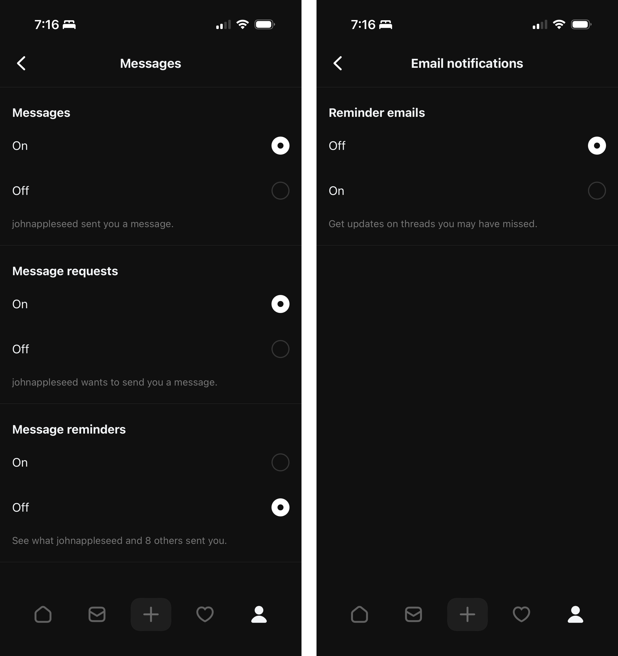 Sneaky sneaky! Threads swaps the On/Off position for its email notifications setting compared to all the other ones. Unsurprised, but they almost got me.